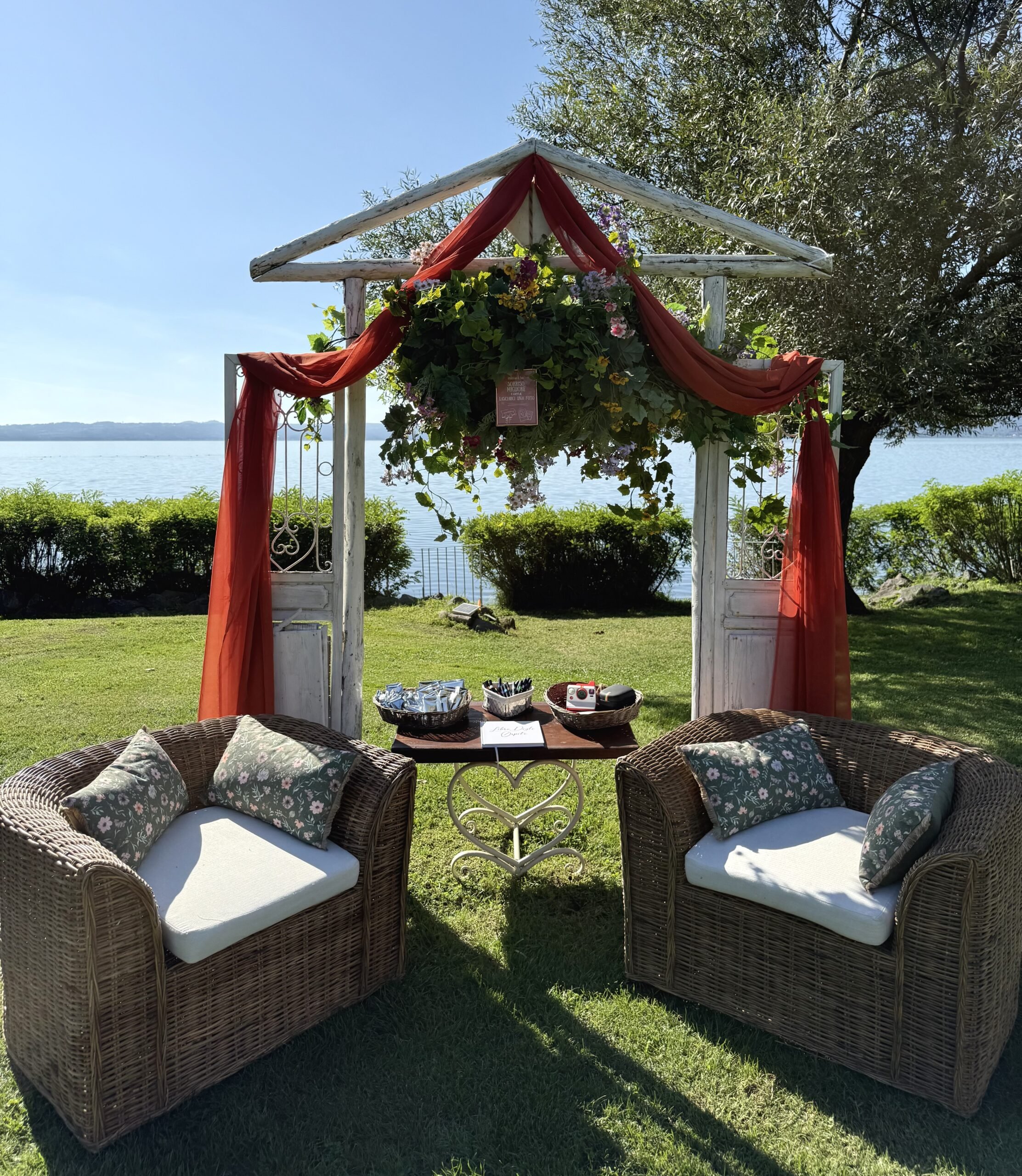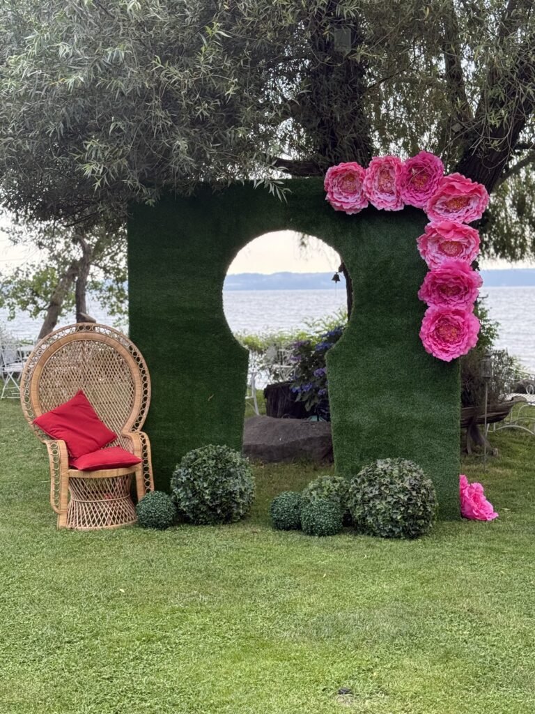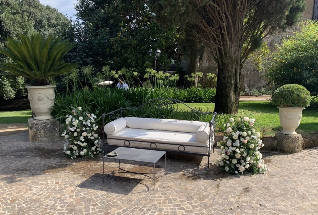 Oltre alle composizioni e cornici di fiori, forniamo materiali di arredo come sedute, tavolini, ombrelloni, stoffe, tappeti ecc.